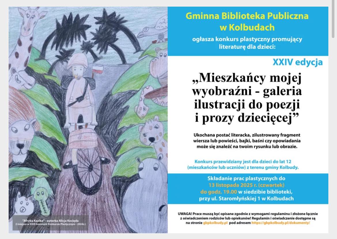 ''Mieszkańcy mojej wyobraźni – galeria ilustracji do poezji i prozy dziecięcej” - Konkurs organizowany przez Gminną Bibliotekę w Kolbudach