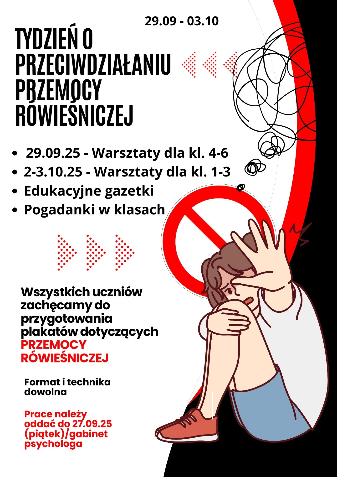 Dodatkowo zachęcamy uczniów do przygotowania plakatów dot. przemocy rówieśniczej (format i technika dowolna). Ważne aby dostarczyć pracę najpóźniej do 27 września (piątek) do pokoju psychologa. Każda praca ucznia zostanie doceniona poprzez otrzymanie uwagi pozytywnej za zaangażowanie i wkład w „Tydzień przeciwdziałania przemocy rówieśniczej”. Liczymy na wspólne działanie :)